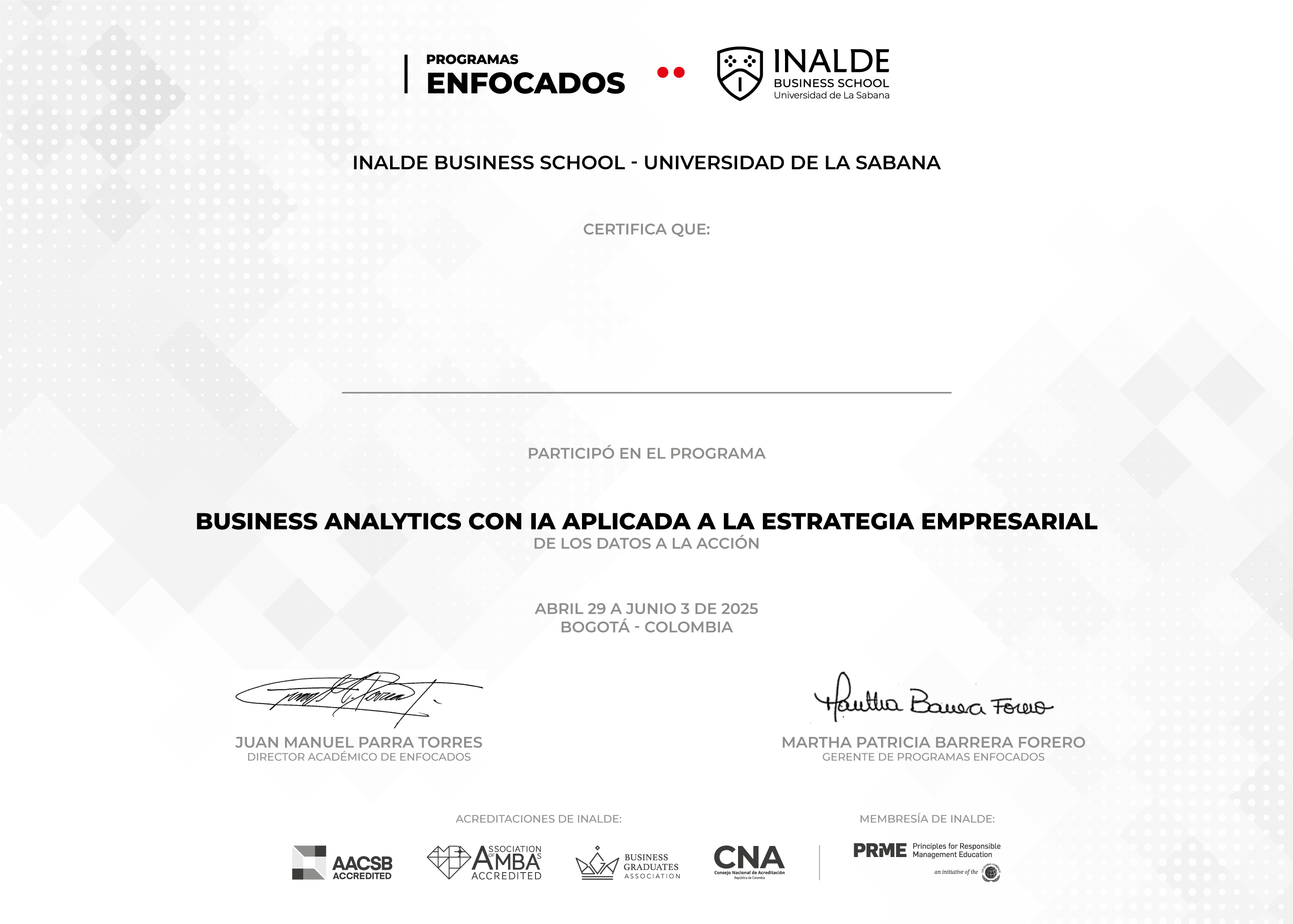 Todos los participantes que completen con éxito el programa recibirán un Certificado del curso de INALDE Business School.